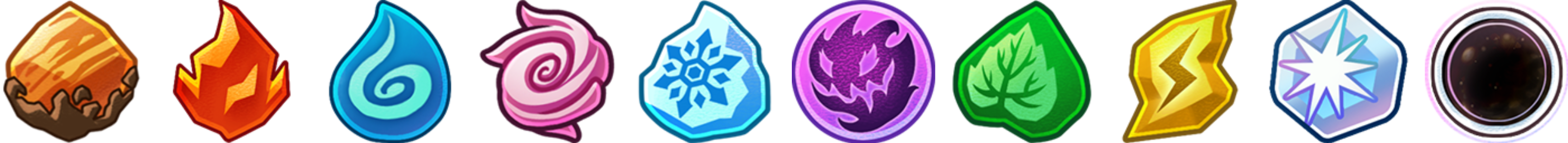 <figure><img src="https://1519831687-files.gitbook.io/~/files/v0/b/gitbook-x-prod.appspot.com/o/spaces%2FVZCj6PZX68ezEpzBuWty%2Fuploads%2F65a3Yr4vN3eYRCIIYQAa%2Felements_list.png?alt=media&#x26;token=1a07b282-21c8-474e-a1f3-f8cc6d3bd1e9" alt="" width="563"><figcaption><p>Terrafirm, Pyroflame, Aquasurge, Cyclonis, Cryonyx, Umbranyx, Sylvanyx, Voltanyx, Solphaeon, and Oblivaeon</p></figcaption></figure>